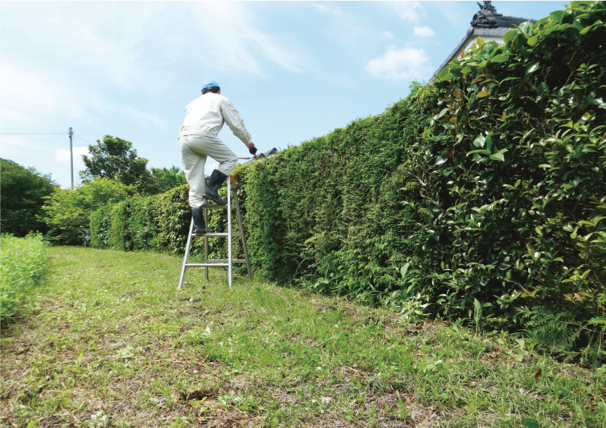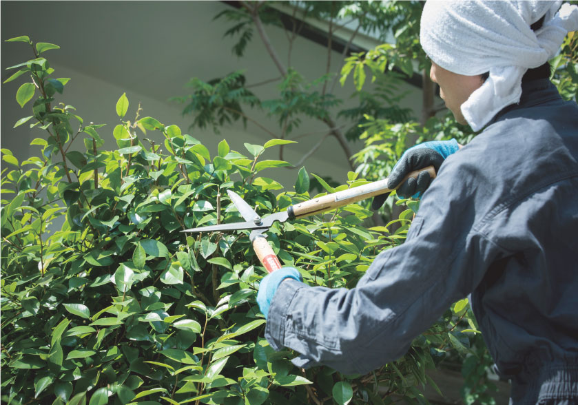 個人宅の他、アパートやマンションの生垣の枝葉を切り、整えます。定期的に剪定することで形が崩れたり、大きくなり過ぎたりしないよ う管理することができます。 剪定をしていないと外側はボサボサで内側の葉は枯れてスカスカになってしまいます。 年に1~2回を目安に、剪定することをおすすめします。
